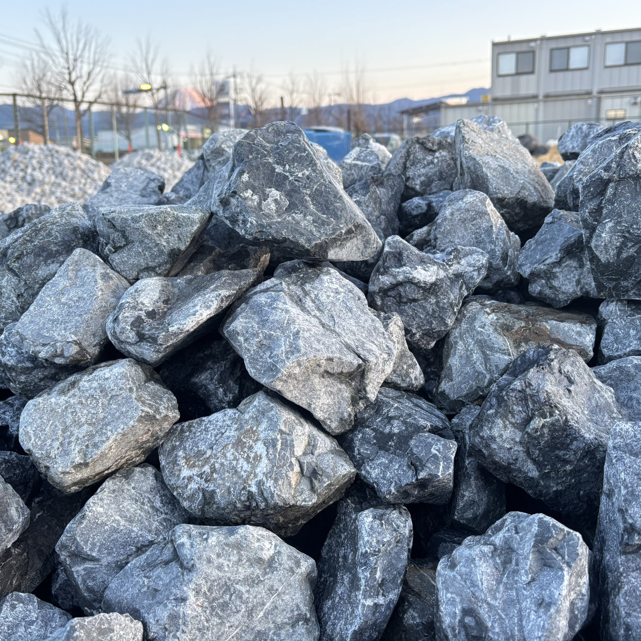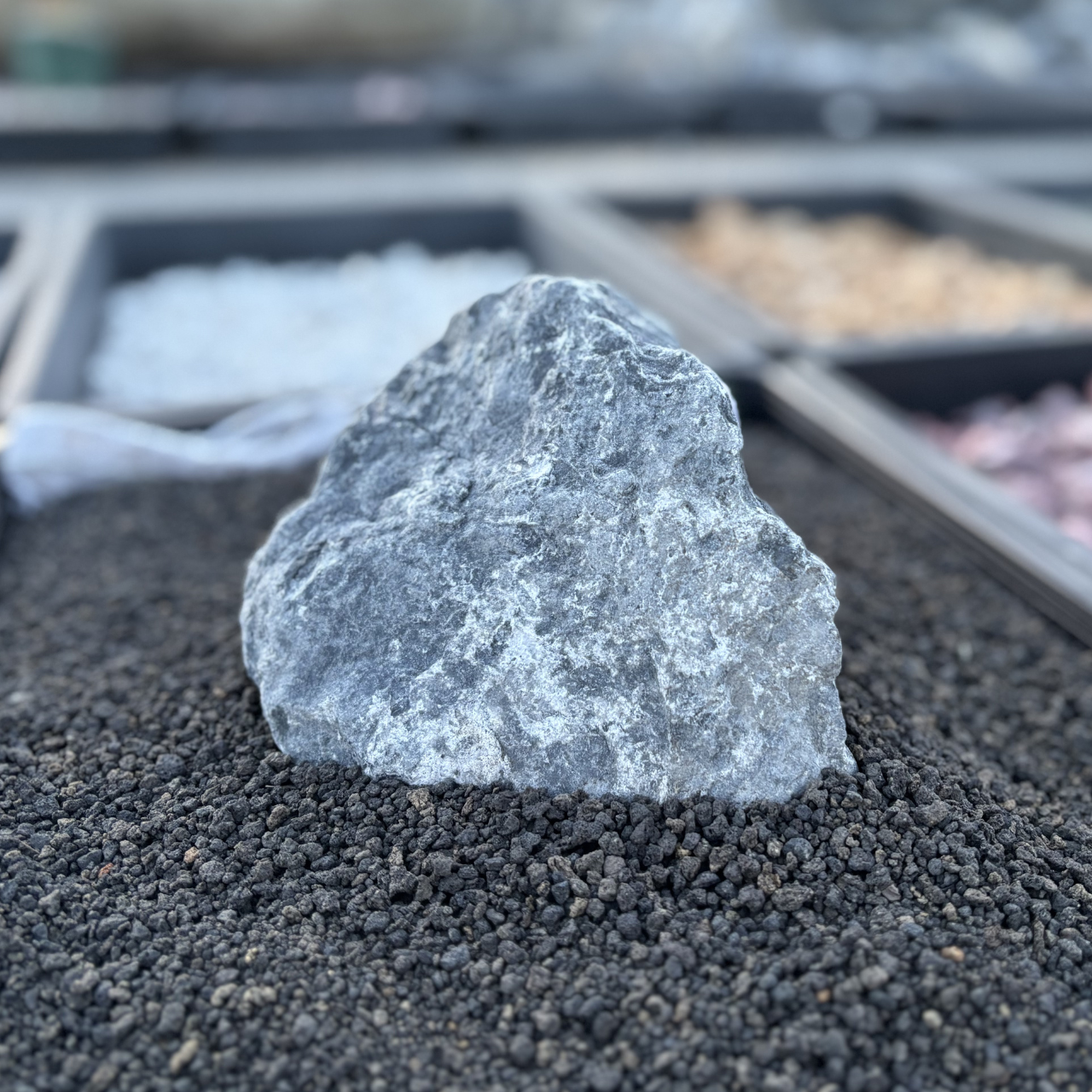 特記:ごつごつした割れ形状でありつつ、白い筋と青っぽい黒を基調として、所々に黄土色のコントラスト。自然な風合いと、あまり見かけないこの石の特徴は、景観石、アクセント、空間に自然を作る、植物とセットで石が主役になったり、空間を演出したり、絶妙な存在として役立つ石です。また、鉱物的魅力もあります。